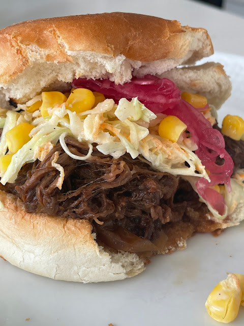 Till detta serverade jag till bugern: cole slaw, picklad rödlök och majs.